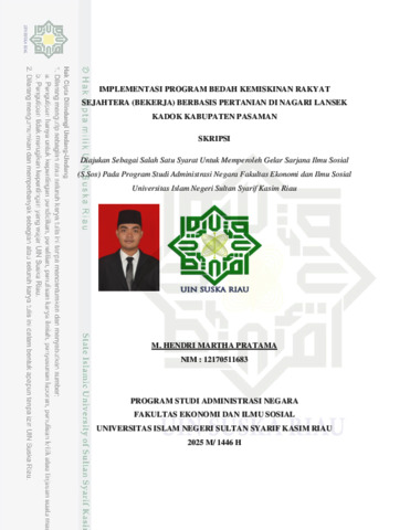 ABSTRAK IMPLEMENTASI PROGRAM BEDAH KEMISKINAN RAKYAT SEJAHTERA (BEKERJA) BERBASIS PERTANIAN DI NAGARI LANSEK KADOK KABUPATEN PASAMAN Oleh: M. HENDRI MARTHA PRATAMA NIM : 12170511683 Penelitian ini dilatar belakangi oleh ketidakmampuan keluarga memenuhi kebutuhan pangan yang menjadi kebutuhan paling mendasar, menjadi kendala bagi upaya untuk melepas diri dari belenggu kemiskinan, dikarenakan belum optimalnya pendistribusian bantuan terhadap masyarakat, kurangnya sosialisai kepada masyarakat tentang program Bekerja, kurangnya pengawasan terhadap berjalannya program, serta kurangnya partisipasi dan kesadaran masyarakat terhadap program Bekerja. Penelitian ini bertujuan untuk: (1) Mendeskripsikan Implementasi Program Bekerja dalam Menjamin Ketahanan Pangan Masyarakat di Nagari Lansek Kadok Kabupaten Pasaman. (2) Mengidentifikasi faktor-faktor yang mempengaruhi Implementasi Program Bekerja dalam Menjamin Ketahanan Pangan Masyarakat di Nagari Lansek Kadok Kabupaten Pasaman. (3) Mengidentifikasi solusi yang dilakukan untuk mengatasi kendala dalam Implementasi Program Bekerja dalam Menjamin Ketahanan Pangan Masyarakat di Nagari Lansek Kadok Kabupaten Pasaman. Penelitian ini menggunakan metode kualitatif yang bersifat deskriptif. Lokasi penelitian dilakukan di Nagari Lansek Kadok Kabupaten Pasaman. Informan penelitian ditentukan secara Purposive Sampling. Data penelitian ini didapatkan dari observasi, wawancara, dan studi dokumentasi. Hasil penelitian ini menunjukkan bahwa Implementasi Kebijakan Program Bedah Kemiskinan Rakyat Sejahtera (Bekerja) berbasis pertanian belum bisa dikatakan terlaksana dengan baik, karena masih terjadi ketidakmerataan pendistribusian bantuan dan masih ada masyarakat yang belum mengetahui tentang program Bedah Kemiskinan Rakyat Sejahtera (Bekerja) dalam menjamin ketahanan pangan masyarakat di Nagari Lansek Kadok Kabupaten Pasaman. Kata Kunci: Implementasi kebijakan, Program, Bedah Kemiskinan Rakyat Sejahtera (Bekerja), Nagari Lansek Kadok.