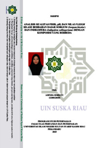 ADINDA RAHAYU(2025) : ANALISIS KUALITAS FISIK, pH, DAN NILAI FLEIGH SILASE BERBAHAN DASAR SORGUM (Sorgum bicolor) DAN INDIGOFERA (Indigofera zollingeriana) DENGAN KOMPOSISI YANG BERBEDA,,Silase merupakan solusi untuk penyimpanan hijauan pakan ternak jangka panjang. Penelitian ini bertujuan untuk menganalisis kualitas fisik (pH, warna, aroma, keberadaan jamur, tekstur, dan nilai fleigh) silase sorgum dan indigofera dengan komposisi yang berbeda. Penelitian ini telah dilakukan di Laboratorium Nutrisi dan Teknologi Pakan, Universitas Islam Negeri Sultan Syarif Kasim Riau, pada bulan Juli hingga September 2024. Penelitian ini menggunakan Rancangan Acak Lengkap (RAL) yang terdiri dari 4 perlakuan P0 (100% sorgum), P1 (sorgum 70% + 30% indigofera), P2 (30% indigofera + 70% sorgum), P3 (100% indigofera) dengan 5 ulangan. Parameter yang diamati adalah pH, aroma, warna, tekstur, keberadaan jamur, dan nilai fleigh. Hasil penelitian menunjukkan bahwa perlakuan sangat bepengaruh nyata (P<0,01) terhadap pH, warna, tekstur, keberadaan jamur, dan nilai fleigh, tetapi tidak bepengaruh nyata (P>0,05) terhadap aroma silase. Rata-rata nilai parameter silase yang didapat yaitu, pH 3,72-4,62 (sangat baik), warna 3,28-4,53 (kuning kecoklatan), aroma 3,00-3,35 (asam), tekstur 3,60-3,73 (lembut, dan mudah dipisahkan), keberadaan jamur 3,10-3,60 (sedikit jamur), nilai fleigh 28,45- 65,89 (cukup baik). Kesimpulan dari penelitian ini adalah silase berbahan dasar sorgum dan indigofera yang terbaik adalah pada kombinasi 70% sorgum dan 30% indigofera. Kata kunci: indigofera, kualitas fisik, silase, sorgum