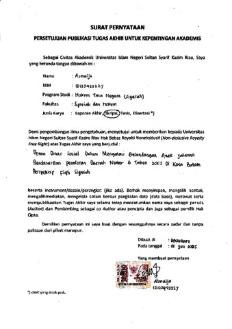 ABSTRAK Asmaija, (2025): Peran Dinas Sosial Dalam Mengatasi Gelandangan Anak Jalanan Berdasarkan Peraturan Daerah Nomor 6 Tahun 2002 Di Kota Batam Perspektif Fiqh Siyasah Fenomena gelandangan anak jalanan di Kota Batam menjadi permasalahan sosial yang memerlukan perhatian serius. Kota Batam sebagai wilayah industri dan transit interasional mengalami pertumbuhan ekonomi yang pesat, namun di sisi lain juga menghadapi ketimpangan sosial yang tinggi. Anak jalanan menjadi kelompok rentan yang hidup tanpa perlindungan yang layak dan sering kali mengganggu ketertiban umum. Untuk itu, Pemerintah Kota Batam memulai Peraturan Daerah Nomor 6 Tahun 2002 Tentang Ketertiban Sosial telah memberikan dasar hukum bagi Dinas Sosial untuk mengambil langkah penanganan terhadap anak jalanan dan gelandangan. Rumusan masalah dalam penelitian ini meliputi: (1) bagaimana Peran Dinas Sosial dalam mengatasi gelandangan anak jalanan di Kota Batam (2) kendala apa saja yang dihadapi dalam pelaksanaannya (3) bagaimana pandangan fiqh siyasah terhadap peran tersebut. Penelitian ini bertujuan untuk menjelaskan pelaksanaan peran Dinas Sosial, menganalisis hambatan-hambatan yang dihadapi, serta meninjau peran tersebut dalam perspektif fiqh siyasah. Penelitian ini adalah penelitian lapangan. Metode yang digunakan adalah pendekatan kualitatif dengan metode deskriptif dengan teknik pengumpulan data melalui observasi, wawancara, dan dokumentasi. Subjek penelitian terdiri dari Kepala Rehabilitasi Sosial Dinas Sosial, anggota Satpol PP, dan anak jalanan. Hasil penelitian menunjukkan bahwa Dinas Sosial Kota Batam telah menjalankan tugasnya melalui pembinaan fisik, mental, keterampilan, dan pendataan terhadap anak jalanan, serta melakukan kerjasama dengan Satpol PP melalui Tim Reaksi Cepat (TRC). Namun pelaksanaannya masih menghadapi berbagai kendala, seperti keterbatasan dana, perlawanan dari anak jalanan, dan minimnya sarana prasarana. Dalam perspektif fiqh siyasah, peran dinas sosial mencerminkan tanggung jawab negara dalam menjamin kesejahteraan rakyat, namun pelaksanaannya belum sepenuhnya mencerminkan prinsip siyasah dusturiyah yang ideal karena belum efektif mengentaskan permasalahan secara menyeluruh. Kata Kunci: Dinas Sosial, Anak Jalanan, Pe.rda No. 6 Tahun 2002.
