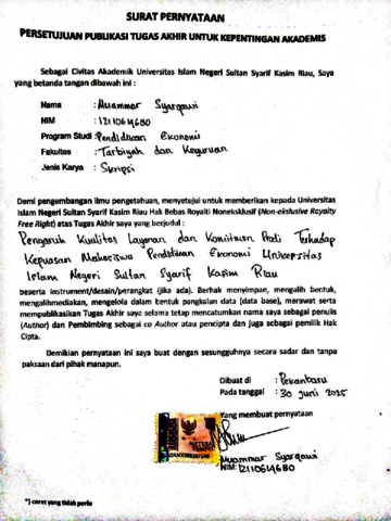 MUAMMAR SYARQAWI, - (2025) PENGARUH KUALITAS LAYANAN DAN KOMITMEN PRODI TERHADAP KEPUASAN MAHASISWA PENDIDIKAN EKONOMI UNIVERSITAS ISLAM NEGERI SULTAN SYARIF KASIM RIAU. Skripsi thesis, UNIVERSITAS ISLAM SULTAN SYARIF KASIM RIAU.