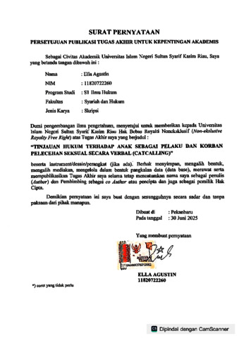 ELLA AGUSTIN, - (2025) TINJAUAN HUKUM TERHADAP ANAK SEBAGAI PELAKU DAN KORBAN PELECEHAN SEKSUAL SECARA VERBAL (CATCALLING). Skripsi thesis, UNIVERSITAS ISLAM NEGERI SULTAN SYARIF KASIM RIAU.