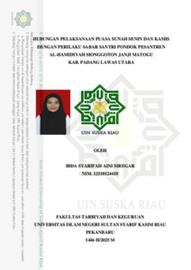 IRDA SYARIFAH AINI SIREGAR, - (2025) HUBUNGAN PELAKSANAAN PUASA SUNAH SENIN DAN KAMIS DENGAN PERILAKU SABAR SANTRI PONDOK PESANTREN AL-HAMIDIYAH SIONGGOTON JANJI MATOGU KAB. PADANG LAWAS UTARA. Skripsi thesis, UNIVERSITAS ISLAM NEGERI SULTAN SYARIF KASIM RIAU.