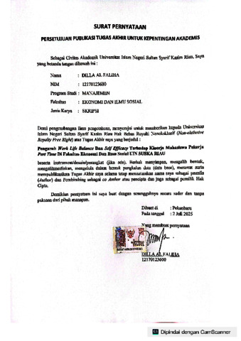 ABSTRAK PENGARUH WORK LIFE BALANCE DAN SELF EFFICACY TERHADAP KINERJA MAHASISWA PEKERJA PART-TIME DI FAKULTAS EKONOMI DAN ILMU SOSIAL UIN SUSKA RIAU Oleh DILLA AL FALIHA 12170123600 Penelitian ini dilakukan di lingkungan Fakultas Ekonomi dan Ilmu Sosial UIN SUSKA RIAU. Tujuan utama dari penelitian ini adalah untuk mengetahui pengaruh Work Life Balance dan Self Efficacy terhadap Kinerja Mahasiswa Pekerja Part-Time di fakultas tersebut, baik secara parsial maupun secara simultan. Populasi dalam penelitian ini mencakup seluruh mahasiswa di Fakultas Ekonomi dan Ilmu Sosial UIN SUSKA RIAU yang menjalani aktivitas perkuliahan sambil bekerja. Meskipun jumlah pastinya tidak diketahui secara pasti, namun pengambilan sampel dilakukan terhadap 36 responden dengan menggunakan metode non-probability sampling, jenis convenience sampling /accidental sampling. Penelitian ini menggunakan data primer dan sekunder, sementara pendekatan analisis yang digunakan adalah deskriptif kuantitatif. Hasil analisis menunjukkan bahwa secara parsial, Work Life Balance memiliki pengaruh signifikan terhadap Kinerja Mahasiswa Pekerja Part Time. Di sisi lain, variabel Self Efficacy juga menunjukkan pengaruh signifikan namun bersifat negatif terhadap Kinerja Mahasiswa Pekerja Part Time. Secara simultan, kedua variabel tersebut terbukti berpengaruh terhadap Kinerja Mahasiswa Pekerja Part-Time di Fakultas Ekonomi dan Ilmu Sosial UIN SUSKA RIAU. Adapun kontribusi gabungan dari Work Life Balance dan Self Efficacy terhadap Kinerja Mahasiswa Pekerja Part Time ditunjukkan oleh nilai koefisien determinasi sebesar 82,5%. Sisanya, yaitu sebesar 17,5%, dipengaruhi oleh faktor-faktor lain yang tidak menjadi fokus dalam penelitian ini. Kata Kunci : Work Life Balance, Self Efficacy, Kinerja