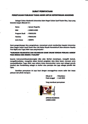 APRYAN NUGRAHA, - (2025) HUBUNGAN RELIGIUSITAS DAN KECANDUAN GAME ONLINE DENGAN PERILAKU AGRESIF PADA REMAJA SMA NEGERI 2 TUALANG. Skripsi thesis, Universitas Islam Negeri Sultan Syarif Kasim Riau.