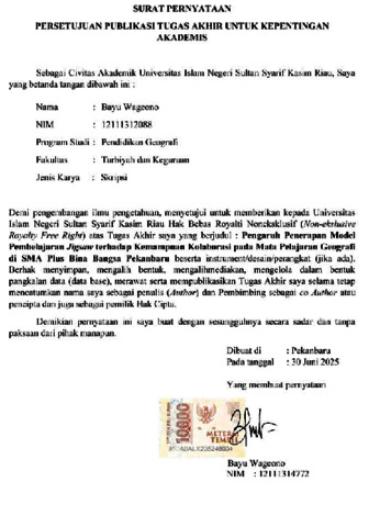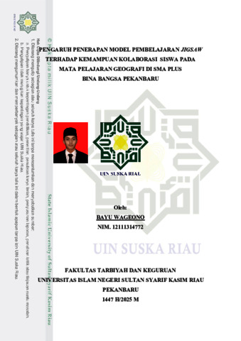 BAYU WAGEONO, - (2025) PENGARUH PENERAPAN MODEL PEMBELAJARAN JIGSAW TERHADAP KEMAMPUAN KOLABORASI SISWA PADA MATA PELAJARAN GEOGRAFI DI SMA PLUS BINA BANGSA PEKANBARU. Skripsi thesis, UNIVERSITAS ISLAM NEGERI SULTAN SYARIF KASIM RIAU.