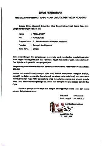 ANISA ZAHRA, - (2025) PENGEMBANGAN MULTIMEDIA INTERAKTIF BERBASIS ADOBE ANIMATE PADA MATERI PECAHAN UNTUK KELAS II SD/MI. Skripsi thesis, UNIVERSITAS ISLAM NEGERI SULTAN SYARIF KASIM RIAU.