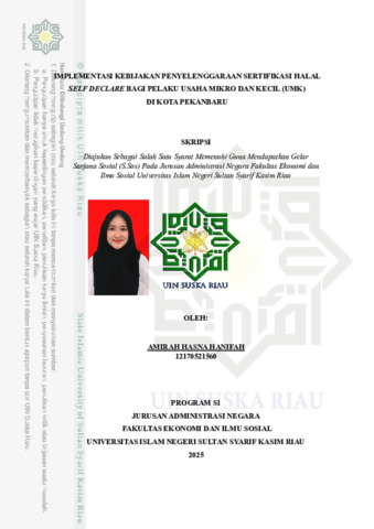 ABSTRAK IMPLEMENTASI KEBIJAKAN PENYELENGGARAAN SERTIFIKASI HALAL SELF DECLARE BAGI PELAKU USAHA MIKRO DAN KECIL (UMK) DI KOTA PEKANBARU Oleh: Amirah Hasna Hanifah NIM. 12170521560 Kota Pekanbaru memiliki populasi terbanyak dalam hal pemilik usaha mikro dan kecil jika dibandingkan dengan Kabupaten/kota lainnya. Sesuai UU 33 tahun 2014 pelaku usaha di wajibkan melakukan suatu legalitas yaitu sertifikasi halal, dalam hal ini self declare menjadi jalur yang dikhususkan untuk pelaku UMK. Tujuan penelitian ini adalah mengetahui Implementasi Kebijakan Penyelenggaraan Sertifikasi Halal Self Declare Bagi Pelaku Usaha Mikro dan Kecil (UMK) di Kota Pekanbaru. Metode penelitian yang digunakan adalah metode kualitatif dengan pendekatan deskriptif. Pada penelitian ini menggunakan teori Implementasi kebijakan dari George Edward III. Hasil penelitian ini menunjukkan bahwa Implementasi Kebijakan Penyelenggaraan Sertifikasi Halal Self Declare Bagi Pelaku Usaha Mikro dan Kecil (UMK) di Kota Pekanbaru sudah cukup baik, hal ini dapat dilihat dari pertama, indikator komunikasi dalam hal ini dilaksanakan oleh satgas layanan jaminan produk halal, pusat pendampingan UIN Suska Riau, dan pendamping proses produk halal melalui komunikasi langsung dan tidak langsung. Kedua, indikator sumber daya ini didukung oleh adanya pelatihan terhadap pendamping proses produk halal sebelum mendampingi pelaku usaha. Ketiga, indikator disposisi dalam proses pengangkatan sudah sesuai dengan peraturan yang ada, meski demikian masih terdapat para pendamping yang non aktif. Keempat, indikator struktur birokrasi sudah terdapat standar operasional prosedur (SOP) pada penyelenggaraannya dan juga upaya koordinasi yang terus dilaksanakan dengan berbagai pihak terkait. Implementasi Kebijakan penyelenggaraan sertifikasi halal self declare beriringan dengan beberapa hambatan diantaranya masih terdapat pendamping proses produk halal yang tidak aktif dan kurangnya kesadaran pelaku usaha mikro dan kecil di Kota Pekanbaru terhadap produk halal. Kata kunci: Sertifikasi halal, self declare, Implementasi Kebijakan, Usaha mikro dan kecil (UMK).