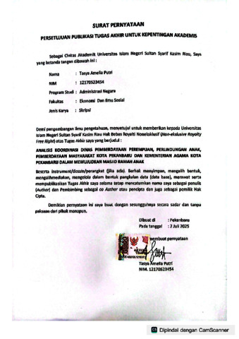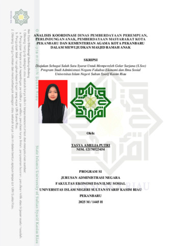 ABSTRAK ANALISIS KOORDINASI DINAS PEMBERDAYAAN PEREMPUAN, PERLINDUNGAN ANAK, PEMBERDAYAAN MASYARAKAT KOTA PEKANBARU DAN KEMENTERIAN AGAMA KOTA PEKANBARU DALAM MEWUJUDKAN MASJID RAMAH ANAK Oleh TASYA AMELIA PUTRI NIM. 12170523454 Tujuan penelitian ini adalah untuk mengetahui bentuk koordinasi serta faktor penghambat yang dihadapi dalam mewujudkan Masjid Ramah Anak di Kota Pekanbaru. Latar belakang penelitian ini didasarkan pada pentingnya keberadaan masjid sebagai ruang publik yang ramah anak, yang mendukung tumbuh kembang anak secara spiritual, sosial, dan emosional, serta sebagai bentuk implementasi dari program Kota Layak Anak. Penelitian ini menggunakan pendekatan kualitatif dengan metode deskriptif. Teknik pengumpulan data dilakukan melalui wawancara mendalam, observasi langsung, dan dokumentasi. Informan dalam penelitian terdiri dari pihak DP3APM, Kementerian Agama, pengurus masjid, orang tua, dan anak. Penelitian ini dianalisis menggunakan teori koordinasi yang mencakup kesatuan tindakan, komunikasi, pembagian kerja, disiplin. Hasil penelitian menunjukkan bahwa bentuk koordinasi antara kedua instansi meliputi pelaksanaan rapat bersama, pembagian peran, serta pelaksanaan kegiatan koordinatif dalam sosialisasi dan pelatihan Masjid Ramah Anak. Namun, koordinasi tersebut belum berjalan maksimal karena terkendala oleh keterbatasan anggaran, minimnya pemahaman pengurus masjid tentang konsep ramah anak, serta kurangnya keterlibatan masyarakat. Meskipun demikian, terdapat kesamaan visi antara DP3APM dan Kementerian Agama untuk menciptakan lingkungan masjid yang aman, nyaman, dan mendidik bagi anak-anak. Sinergi yang baik antara DP3APM, Kementerian Agama, pengurus masjid, dan juga masyarakat juga diperlukan untuk menciptakan pengelolaan yang lebih efektif, termasuk dalam memperluas sosialisasi, serta memperkuat regulasi dan alokasi anggaran guna mendorong percepatan program Masjid Ramah Anak secara berkelanjutan di Kota Pekanbaru. Kata Kunci: Koordinasi, Masjid Ramah Anak, Kota Pekanbaru.