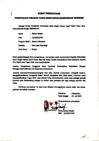 RAIHAN MUKTI, - (2025) ANALISIS PENGALAMAN PENGGUNA PADA FACEBOOK MARKETPLACE PEKANBARU DENGAN MENGGUNAKAN METODE USER EXPERIENCE QUESTIONER. JURNAL INOVTEK POLBENG -SERI INFORMATIKA, 10 (2). pp. 729-740. ISSN ISSN : 2527-9866