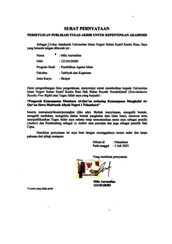 ABSTRAK Mila Aurmalina (2025) : Pengaruh Kemampuan Membaca Al-Qur’an terhadap Menghafal Al-Qur’an Siswa Madrasah Aliyah Negeri 1 Pekanbaru Penelitian Ini bertujuan untuk menguji pengaruh kemampuan membaca Al-Qur‟an terhadap menghafal Al-Qur‟an siswa Madrasah Aliyah Negeri 1 Pekanbaru. Penelitian ini termasuk pendekatan kuantitatif dengan jenis penelitian korelasi. Populasi dalam penelitian ini adalah 41 siswa dan pengambilan sampel menggunakan Teknik sampling jenuh atau pengambilan sampel keseluruhan. Pengumpulan data dilakukan menggunakan tes dan dokumentasi. Teknik analisis data menggunakan uji korelasi product moment. Hasil penelitian dan analisis data dengan menggunakan SPSS diperoleh rhitung 0,474 > rtabel 0,312 pada taraf signifikansi 5%, pada taraf signifikansi 1% nilai signifikansi 0,002 < 0,05, dengan demikian Ha diterima dan Ho ditolak. Hal ini berarti terdapat pengaruh kemampuan membaca Al-Qur‟an terhadap menghafal Al-Qur‟an siswa Madrasah Aliyah Negeri 1 Pekanbaru. Kata Kunci : Kemampuan Membaca Al-Qur’an, Kemampuan Menghafal Al-Qur’an