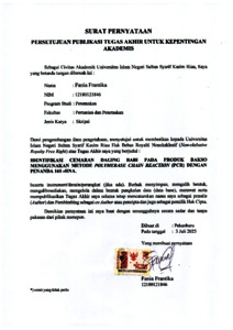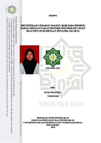 IDENTIFIKASI CEMARAN DAGING BABI PADA PRODUK BAKSO MENGGUNAKAN METODE POLYMERASE CHAIN REACTION (PCR) DENGAN PENANDA 16S rRNA Fania Frantika (12180121846) Di bawah bimbingan Restu Misrianti dan Irdha Mirdhayati INTISARI Bakso merupakan salah satu produk pangan yang populer di Indonesia. Namun, produk ini rentan terhadap pencemaran bahan non halal khususnya daging babi, sehingga menimbulkan keresahan bagi masyarakat muslim. Penelitian ini bertujuan untuk mengidentifikasi cemaran daging babi pada produk bakso menggunakan metode Polymerase Chain Reaction (PCR) dengan penanda gen 16S rRNA. Penelitian ini menggunakan metode eksperimen dan survei. Sampel bakso diambil secara purposif, dengan total 30 sampel. Ekstraksi DNA dilakukan menggunakan kit Zymo Research, kemudian dilakukan pengujian kualitas DNA menggunakan elektroforesis dan kuantitas DNA menggunakan spektrofotometer. Amplifikasi DNA menggunakan teknik multiplex PCR dengan primer spesifik gen 16S rRNA. Parameter penelitian meliputi pengujian kualitas dan kuantitas DNA hasil ekstraksi serta keberhasilan amplifikasi PCR. Hasil penelitian menunjukkan bahwa konsentrasi DNA dari 30 sampel bakso yang diuji berkisar antara 21,180 hingga 235,403 ng/µL, dengan rasio kemurnian DNA antara 1,46 hingga 2,49, hasil PCR dengan penanda gen 16S rRNA, dari 30 sampel bakso yang diuji, tidak ditemukan adanya cemaran DNA daging babi. Kesimpulan dari penelitian ini adalah bahwa metode PCR dengan penanda gen 16S rRNA terbukti efektif untuk mendeteksi keberadaan DNA babi dan dapat digunakan sebagai alat verifikasi kehalalan produk bakso. Kata kunci: bakso, daging babi, PCR, 16S rRNA, kehalalan pangan, DNA