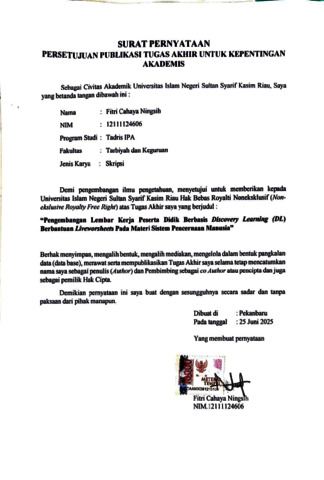 FITRI CAHAYA, - (2025) PENGEMBANGAN LKPD BERBANTUAN LIVEWORKSHEETS BERBASIS DISCOVERY LEARNING (DL) PADA MATERI SISTEM PENCERNAAN MANUSIA. Skripsi thesis, UNIVERSITAS ISLAM NEGERI SULTAN SYARIF KASIM RIAU.
