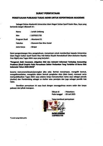 ABSTRAK PENGARUH DEBT COVENANT, LITIGATION RISK DAN ASIMETRI INFORMASI TERHADAP ACCOUNTING PRUDENCE (Studi Empiris Pada Perusahaan Sektor Perbankan Yang Terdaftar di Bursa Efek Indonesia Tahun 2020-2023) Oleh: JURIAH LIMBONG NIM. 11870321735 Penelitian ini bertujuan untuk menganalisis pengaruh debt covenant, litigation risk dan asimetri informasi terhadap accounting prudence. Penelitian ini menggunakan metode kuantitatif, dengan teknik purposive sampling dan terpilih tiga puluh tujuh perusahaan sektor perbankan yang terdaftar di Bursa Efek Indonesia selama periode 2020-2023. Dalam menganalisis data sekunder, penelitian ini menggunakan regresi data panel yang diolah menggunakan aplikasi program Eviews 12. Hasil penelitian menunjukkan bahwa debt covenant berpengaruh negatif terhadap accounting prudence, artinya tinggi rendahnya jumlah utang perusahaan tidak memberikan pengaruh dalam pelaporan keuangan yang prudence. Litigation risk berpengaruh positif terhadap accounting prudence, sebab risiko tuntutan hukum akan mendorong manajer lebih prudence dalam membuat laporan keuangan. Asimetri informasi berpengaruh negatif terhadap accounting prudence, artinya asimetri informasi antara investor dan manajemen perusahaan tidak mempengaruhi penyusunan laporan keuangan yang lebih prudence. Kata kunci: Accounting Prudence, Debt Covenant, Litigation Risk, Asimetri Informasi