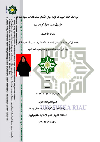ABSTRAK Jen Sio (2025) : Pengalaman Belajar Bahasa Arab Dalam Membentuk Maharah Al-Kalam Santriwati Di Pondok Pesantren Syafa'aturrasul Teluk Kuantan Riau. Penelitian ini dilatar belakangi oleh pengalaman belajar bahasa arab dalam Membentuk Maharah Al-Kalam Santriwati Di Pondok Pesantren Syafa'aturrasul Teluk Kuantan Riau. Penelitian ini bertujuan untuk mendeskripsikan bagaimana pengalaman belajar Bahasa arab dalam membentuk maharah al-kalam santriwati. Dan untuk mengetahui kemudian mendeskripsikan factor-faktor yang menjadi pendukung dan penghambat dalam membentuk maharah al-kalam santriwati Di Pondok Pesantren Syafa'aturrasul Teluk Kuantan Riau. Jenis penelitian ini adalah penelitian fenomenologi dengan menggunakan pendekatan kualitatif. Informan dalam penelitian ini adalah guru serta musyrifah Bahasa arab, dan santriwati Aliyah pondok pesantren syafa’aturrasul. Teknik pengumpulan data menggunakan observasi, wawancara, dan dokumentasi. Serta Teknik analisis data menggunakan reduksi data, penyajian data, dan penarikan Kesimpulan. Hasil penelitian ini menunjukkan bahwa pertama, Secara garis besar pengalaman belajar bahasa arab dibagi menjadi dua; pengalaman belajar bahasa arab terkait dengan pencapaian kompetensi berbahasa arab resesptif dan kompetensi berbahasa arab produktif. Kedua, faktor pendukung dalam membentuk maharah al-kalam adanya kompetensi dan keteladanan guru, efektivitas siswa dan lingkungan Bahasa. Ketiga, factor penghambatnya adalah latar belakang sekolah siswa, kepercayaan diri berbahasa arab serta saran dan fasilitas sekolah. Kata Kunci: Pengalaman Belajar, Bahasa Arab, Maharatu Al-Kalam