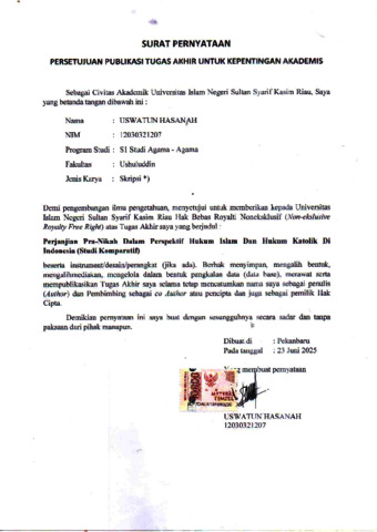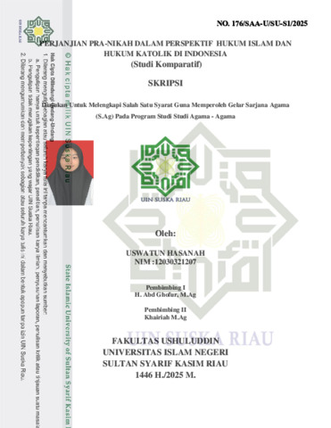 USWATUN HASANAH, - (2025) PERJANJIAN PRA-NIKAH DALAM PERSPEKTIF HUKUM ISLAM DAN HUKUM KATOLIK DI INDONESIA (Studi Komparatif). Skripsi thesis, UNIVERSITAS ISLAM NEGERI SULTAN SYARIF KASIM RIAU.