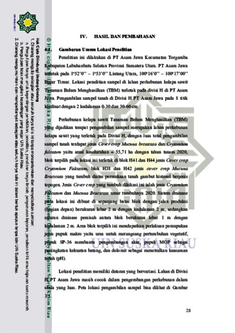 FERRI SUTIYOSO(2025) : PERBANDINGAN KELAS KESUBURAN TANAH HISTOSOL DI PERKEBUNAN KELAPA SAWIT BERDASARKAN COVER CROP,,,PERBANDINGAN KELAS KESUBURAN TANAH HISTOSOL DI PERKEBUNAN KELAPA SAWIT BERDASARKAN COVER CROP,,,,,,,,,Kesuburan tanah merupakan faktor penting dalam keberlanjutan produksi kelapa sawit, terutama pada lahan gambut yang diklasifikasikan kedalam ordo histosol dengan tingkat kesuburan tanah yang rendah. Salah satu strategi untuk meningkatkan kesuburan tanah histosol adalah dengan penggunaan cover crop atau tanaman penutup tanah. Penelitian ini bertujuan untuk mendapatkan perbedaan kelas kesuburan tanah perkebunan kelapa sawit yang menggunakan 2 spesies cover crop, yaitu Mucuna brcateata dan Crytomium falcatum. Penelitian ini dilaksanakan di perkebunan PT Asam Jawa di Kecamatan Torgamba Kabupaten Labuhanbatu Selatan. Penelitian dilakukan secara deskriptif yang menggunakan metode survei dengan penentuan titik sampel secara purposive sampling. Pengambilan sampel tanah dilakukan secara komposit dengan kedalaman 0-30 dan 30-60 cm. Parameter pengamatan yaitu pH tanah, kandungan C-organik, P-tersedia, Kalium, Kapasitas Tukar Kation (KTK), dan Kejenuhan Basa (KB). Tanah yang ditutupi cover crop Crytomium falcatum memiliki nilai 2,61-14,08 pH dan untuk nilai 3,8-15,52 pH H2O, 20,83%-86,71% C-organik, 0,71%-3,54% N-total, 34,06-90,49 ppm P-tersedia, 0,32-3,09 meq/100g Kalium, 29,05-83,98 cmol/kg Kapasitas Tukar Kation (KTK), 9,01%-36,49% Kejenuhan basa (KB). Untuk tanah yang ditutupi cover crop Mucuna bracteata memiliki nilai 0,02-0,38 pH KCL dan untuk nilai 0,03-0,30 pada pH H2O, 2,12%-7,46% Corganik, 0,01%-0,10% N-total, 35,65-70,47 ppm P-tersedia, 0,01-1,82 meq/100g Kalium, 9,90-98,03 cmol/kg Kapasitas Tukar Kation (KTK), 0,50%-0,75% Kejenuhan Basa (KB). Dari hasil penelitian dapat disimpulkan bahwa tanah yang ditutupi cover crop Crytomium falcatum tidak memiliki perbedaan kelas kesuburan tanah dengan cover crop Mucuna bracteata, dimana kelasnya dikelompokkan kategori sedang dan hanya terdapat perbedaan kelas pada blok dilokasi H44 dikedalaman 30-60 cm yaitu termasuk kelas tinggi. Kata kunci : Crytomium falcatum, Mucuna bracteata, kimia tanah, kategori sedang, kategori tinggi, komposit tanah