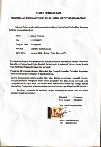 JOANDA PRATAMA, - (2025) PENGARUH CITRA MEREK, CONTENT MARKETING, DAN PROMOSI PENJUALAN TERHADAP KEPUTUSAN PEMBELIAN SMARTPHONE XIAOMI DI KOTA PEKANBARU. Skripsi thesis, UNIVERSITAS ISLAM SULTAN SYARIF KASIM RIAU.
