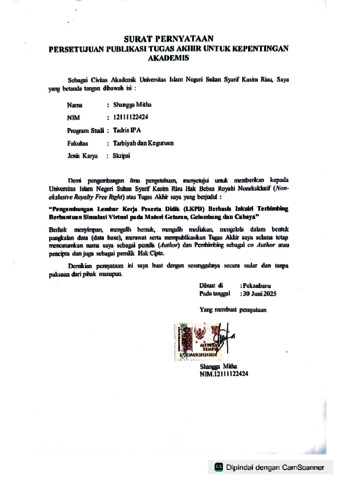 Surat pernyataan persetujuan publikasi tugas akhir untuk kepentingan akademis - SHANGGA MITHA TADRIS Ilmu Pengetahuan Alam.pdf - Published Version Download (415kB) | Preview |