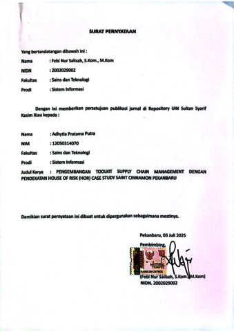 ADHYTIA PRATAMA PUTRA, - (2025) PENGEMBANGAN TOOLKIT SUPPLY CHAIN MANAGEMENT DENGAN PENDEKATAN HOUSE OF RISK (HOR) CASE STUDY SAINT CINNAMON PEKANBARU. JIPI (Jurnal Ilmiah Penelitian dan Pembelajaran Informatika), 11 (2). ISSN 2540-8984