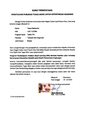 TASYA MAHENDRA, - (2025) PENGARUG PEMBELAJARAN PROBLEM BASED LEARNING (PBL) BERBASIS KEARIFAN LOKAL TERHADAP KEMAMPUAN PEMECAHAN MASALAH PADA MATERI PENCEMARAN LINGKUNGAN. Skripsi thesis, UNIVERSITAS ISLAM NEGERI SULTAN SYARIF KASIM RIAU.