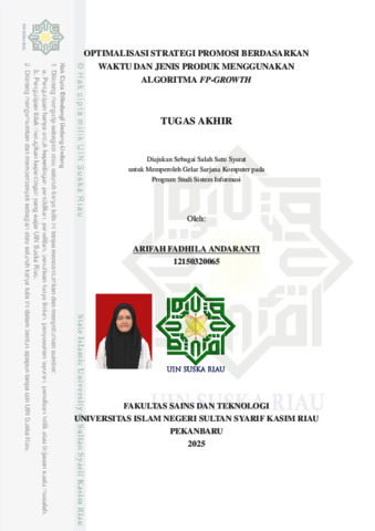 ARIFAH FADHILA ANDARANTI, - (2025) OPTIMALISASI STRATEGI PROMOSI BERDASARKAN WAKTU DAN JENIS PRODUK MENGGUNAKAN ALGORITMA FP-GROWTH. JURNAL SISTEM INFORMASI DAN INFORMATIKA (SIMIKA), 8 (2). ISSN 2622 -6375