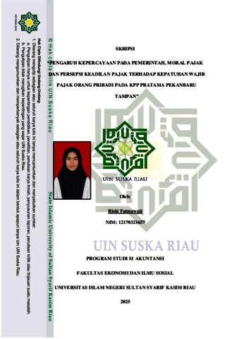 RISKI FATMAWATI, - (2025) “PENGARUH KEPERCAYAAN PADA PEMERINTAH, MORAL PAJAK DAN PERSEPSI KEADILAN PAJAK TERHADAP KEPATUHAN WAJIB PAJAK ORANG PRIBADI PADA KPP PRATAMA PEKANBARU TAMPAN”. Skripsi thesis, UIN SUSKA.