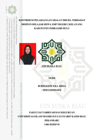 Kontribusi Pelaksanaan Shalat Dhuha terhadap Disiplin Belajar Siswa SMP Negeri 2 Kelayang Kabupaten Indragiri Hulu Penelitian ini bertujuan untuk menguji kontribusi pelaksanaan shalat dhuha terhadap disiplin belajar siswa di SMP Negeri 2 Kelayang. Penelitian dengan pendekatan kuantitatif ini menggunakan desain korelasi. Populasi dalam penelitian ini berjumlah 236 orang, dan sampel penelitian berjumlah 35 orang. Teknik pengambilan sampel menggunakan sampel acak (simple random sampling). Pengumpulan data menggunakan angket, observasi dan dokumentasi. Teknik analisis data menggunakan uji regresi linear sederhana. Hasil penelitian ini menunjukkan bahwa pelaksanaan shalat dhuha memiliki kontribusi terhadap disiplin belajar siswa SMP Negeri 2 Kelayang dengan nilai t hitung 4.043 > t tabel 2,035, maka Ha diterima dan H0 ditolak. Dengan besar kontribusi 18,7% sedangkan sisanya dipengaruhi oleh faktor lain. Kata Kunci: Kontribusi, Shalat Dhuha, Disiplin Belajar