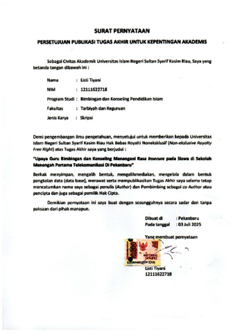 LISTI TIYANI, - (2025) UPAYA GURU BIMBINGAN DAN KONSELING MENANGANI RASA INSECURE PADA SISWA DI SEKOLAH MENENGAH PERTAMA TELEKOMUNIKASI DI PEKANBARU. Skripsi thesis, Universitas Islam Negeri Sultan Syarif Kasim Riau.