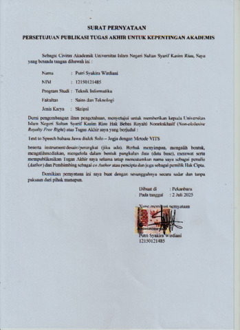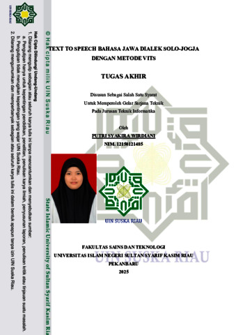 PUTRI SYAKIRA WIRDIANI, - (2025) TEXT TO SPEECH BAHASA JAWA DIALEK SOLO-JOGJA DENGAN METODE VITS. Skripsi thesis, UNIVERSITAS ISLAM NEGERI SULTAN SYARIF KASIM RIAU.