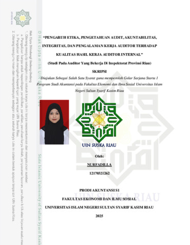 NURFADILLA, - (2025) “PENGARUH ETIKA, PENGETAHUAN AUDIT, AKUNTABILITAS, INTEGRITAS, DAN PENGALAMAN KERJA AUDITOR TERHADAP KUALITAS HASIL KERJA AUDITOR INTERNAL” (Studi Pada Auditor Yang Bekerja Di Inspektorat Provinsi Riau). Skripsi thesis, UNIVERSITAS ISLAM NEGERI SULTAN SYARIF KASIM RIAU.
