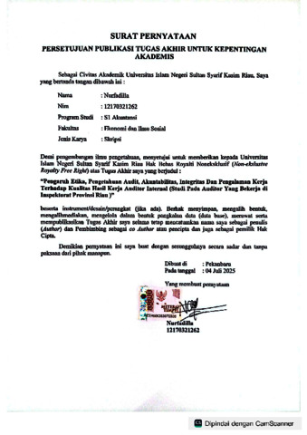 ABSTRAK PENGARUH ETIKA, PENGETAHUAN AUDIT, AKUNTABILITAS, INTEGRITAS, DAN PENGALAMAN KERJA AUDITOR TERHADAP KUALITAS HASIL KERJA AUDITOR INTERNAL (Studi Pada Auditor Yang Bekerja Di Inspektorat Provinsi Riau) Oleh NURFADILLA NIM: 12170321262 Penelitian ini bertujuan untuk menganalisis pengaruh etika, pengetahuan audit, akuntabilitas, integritas, dan pengalaman kerja terhadap kualitas hasil kerja auditor internal pada Inspektorat Provinsi Riau. Penelitian ini menggunakan pendekatan kuantitatif dengan metode survei. Sampel yang digunakan adalah seluruh auditor di Inspektorat Provinsi Riau sebanyak 63 orang yang dipilih melalui teknik total sampling. Data dikumpulkan menggunakan kuesioner dan dianalisis dengan regresi linier berganda menggunakan SPSS 26. Hasil penelitian menunjukkan bahwa variabel etika, pengetahuan audit, akuntabilitas, dan pengalaman kerja berpengaruh signifikan terhadap kualitas hasil kerja auditor internal. Namun, variabel integritas tidak berpengaruh signifikan. Secara simultan, kelima variabel tersebut berpengaruh signifikan terhadap kualitas hasil kerja auditor internal. Temuan ini memberikan implikasi penting bagi penguatan kualitas audit melalui peningkatan etika, kompetensi, dan pengalaman auditor. Kata Kunci: Etika, Pengetahuan Audit, Akuntabilitas, Integritas Pengalaman Kerja, Kualitas Hasil Kerja Auditor Internal.