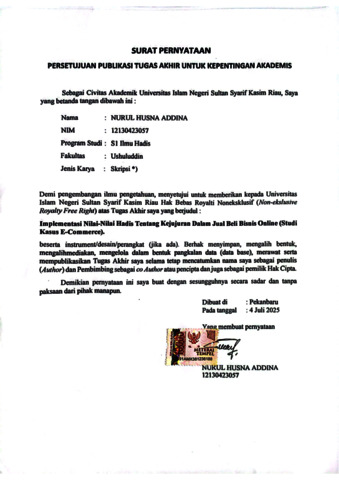 NURUL HUSNA ADDINA, - (2025) IMPLEMENTASI NILAI-NILAI HADIS TENTANG KEJUJURAN DALAM JUAL BELI BISNIS ONLINE ( STUDI KASUS E – COMMERCE). Skripsi thesis, Universitas Islam Negeri Sultan Syarif Kasim Riau.