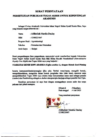 VIABILITAS BENIH KOPI ARABIKA (Coffea arabica L.) DENGAN METODE SEED PRIMING Afdholiah Mardia Daulay (12180221067) Di bawah Bimbingan Indah Permanasari dan Yusmar Mahmud INTISARI Perbanyakan kopi secara generatif menghadapi kendala utama yaitu benih sulit berkecambah akibat kulit benih yang keras, sehingga menghambat proses imbibisi dan memperlambat perkecambahan. Salah satu metode untuk mengatasi hal tersebut adalah seed priming menggunakan larutan H₂SO₄. Penelitian ini bertujuan untuk mengetahui konsentrasi H₂SO₄ terbaik, lama perendaman terbaik, serta interaksi keduanya terhadap viabilitas dan perkecambahan benih kopi Arabika. Penelitian ini telah dilaksanakan pada November 2024 hingga Januari 2025 di Laboratorium Agronomi dan Agrostologi serta Rumah Kasa Laboratorium Universitas Islam Negeri Agriculture Research Development Science, Fakultas Pertanian dan Peternakan Universitas Islam Negeri Sultan Syarif Kasim Riau. Rancangan penelitian menggunakan Rancangan Acak Lengkap (RAL) faktorial dengan 4 ulangan. Faktor pertama adalah konsentrasi H₂SO₄ (0%, 5%, 10%, dan 15%), sedangkan faktor kedua adalah lama perendaman (10, 20, dan 30 menit). Hasil menunjukkan bahwa terdapat interaksi antara konsentrasi H2SO4 10% dan lama perendaman 20 menit terhadap berat larutan terserap (imbibisi). Perendaman benih kopi menggunakan H2SO4 konsentrasi 10% memberikan hasil terbaik terhadap berat larutan terserap, daya berkecambah, tinggi bibit, jumlah daun, panjang radikula, dan berat basah. Lama perendaman 20 menit memberikan hasil terbaik terhadap indeks vigor, dan berat basah batang Perendaman benih kopi Arabika menggunakan H₂SO₄ konsentrasi 10% selama 20 menit berpotensi mempercepat perkecambahan serta meningkatkan viabilitas benih. Kata kunci: daya berkecambah, generatif, H2SO4, imbibisisi, indeks vigor