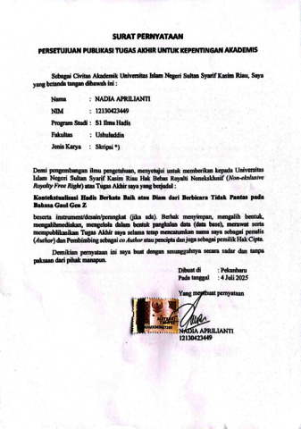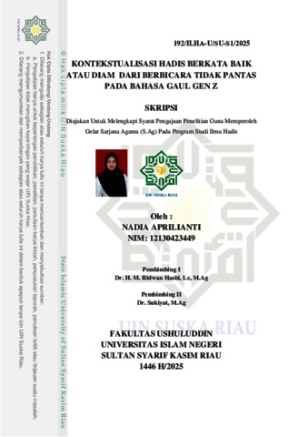 NADIA APRILIANTI, - (2025) KONTEKSTUALISASI HADIS BERKATA BAIK ATAU DIAM DARI BERBICARA TIDAK PANTAS PADA BAHASA GAUL GEN Z. Skripsi thesis, UNIVERSITAS ISLAM NEGERI SULTAN SYARIF KASIM RIAU.