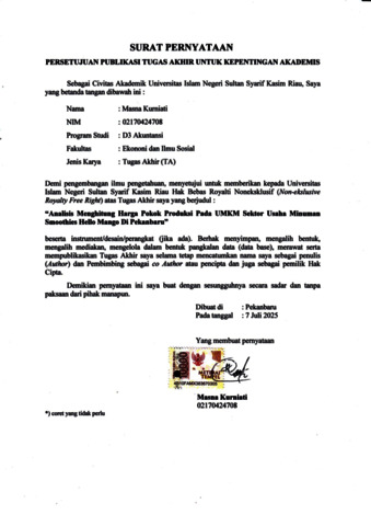 MASNA KURNIATI, - (2025) ANALISIS MENGHITUNG HARGA POKOK PRODUKSI PADA UMKM SEKTOR USAHA MINUMAN SMOOTIES HELLO MANGO DI PEKANBARU. Laporan thesis, UNIVERSITAS ISLAM NEGERI SULTAN SYARIF KASIM RIAU.