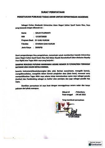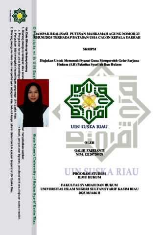 GALIH FAJRIANTI, - (2025) DAMPAK REALISASI PUTUSAN MAHKAMAH AGUNG NOMOR 23 P/HUM/2024 TERHADAP BATASAN USIA CALON KEPALA DAERAH. Skripsi thesis, UNIVERSITAS ISLAM NEGERI SULTAN SYARIF KASIM RIAU.
