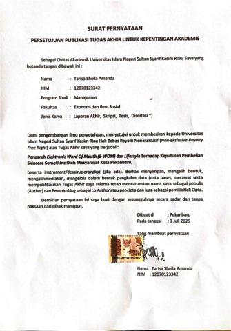 TARISA SHEILA AMANDA, - (2025) PENGARUH ELEKTRONIC WORD OF MOUTH (E-WOM) DAN LIFESTYLE TERHADAP KEPUTUSAN PEMBELIAN SKINCARE SOMETHINC OLEH MASYARAKAT KOTA PEKANBARU. Skripsi thesis, UNIVERSITAS ISLAM NEGERI SULTAN SYARIF KASIM RIAU.