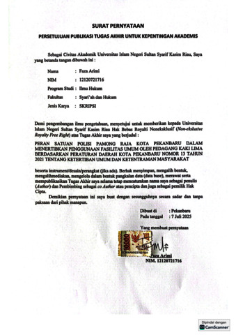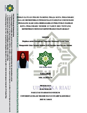 FAZA ARIMI, - (2025) PERAN SATUAN POLISI PAMONG PRAJA KOTA PEKANBARU DALAM MENERTIBKAN PENGGUNAAN FASILITAS UMUM OLEH PEDAGANG KAKI LIMA BERDASARKAN PERATURAN DAERAH KOTA PEKANBARU NOMOR 13 TAHUN 2021 TENTANG KETERTIBAN UMUM DAN KETENTRAMAN MASYARAKAT. Skripsi thesis, Universitas Islam Negeri Sultan Syarif Kasim Riau.