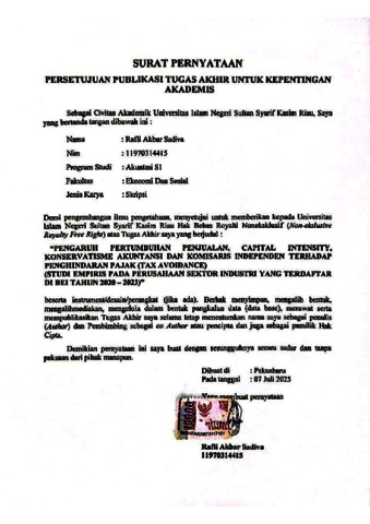 ABSTRAK PENGARUH PERTUMBUHAN PENJUALAN, CAPITAL INTENSITY, KONSERVATISME AKUNTANSI DAN KOMISARIS INDEPENDEN TERHADAP PENGHINDARAN PAJAK (TAX AVOIDANCE) OLEH: RAFLI AKBAR SADIVA 11970314415 Penelitian ini menggunakan pendekatan kuantitatif deskriptif. Tujuan penelitian ini adalah untuk untuk mengetahui pengaruh pertumbuhan penjualan, capital intensity, konservatisme akuntansi dan komisaris independent terhadap penghindaran pajak. (studi empiris pada perusahaan sektor industri yang terdaftar di BEI periode tahun 2020-2023) yang diuji secara parsial dan simultan. Populasi dalam penelitian ini adalah perusahaan sektor industri yang terdaftar di BEI periode tahun 2020-2023. Sampel pada penelitian ini adalah perusahaan sektor industri dengan menggunakan teknik puposive sampling dan mendapatkan 17 perusahaan dengan 4 tahun pengamatan (68 data observasi). Teknik analisis data yang digunakan adalah analisiss regresi data panel dengan bantuan software Eviews12. Hasil penelitian menunjukkan bahwa Secara parsial konservatisme akuntansi memiliki pengaruh signifikan terhadap penghindaran pajak. Sedangkan pertumbuhan penjualan, capital intensity dan komisaris independent tidak memiliki pengaruh signifikan terhadap penghindaran pajak. Secara simultan konservatisme akuntansi pertumbuhan penjualan, capital intensity dan komisaris independent berpengaruh terhadap penghindaran pajak. Keywords: Sales Growth, Capital Intensity, Accounting Conservatism, Independent Commissioner, Tax Avoidance.