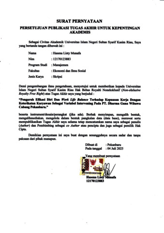 HASENA LISTY MUNAFA, - (2025) PENGARUH EFIKASI DIRI DAN WORK LIFE BALANCE TERHADAP KEPUASAN KERJA DENGAN KETERIKATAN KARYAWAN SEBAGAI VARIABEL INTERVENINGPADA PT. DHARMA GUNA WIBAWA CABANG PEKANBARU. Skripsi thesis, UNIVERSITAS ISLAM NEGERI SULTAN SYARIF KASIM.