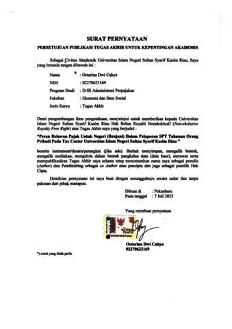 ABSTRAK PERAN RELAWAN PAJAK UNTUK NEGERI (RENJANI) DALAM PELAPORAN SPT TAHUNAN ORANG PRIBADI PADA TAX CENTER UNIVERSITAS ISLAM NEGERI SULTAN SYARIF KASIM RIAU OLEH OCTARINA DWI CAHYA Penelitian ini bertujuan untuk mengetahui peran Relawan Pajak untuk Negeri (Renjani) dalam meningkatkan pelaporan Surat Pemberitahuan (SPT) Tahunan Wajib Pajak Orang Pribadi di Tax Center Universitas Islam Negeri Sultan Syarif Kasim Riau. Penelitian dilakukan pada periode Februari hingga Mei 2025 dengan menggunakan metode deskriptif kualitatif. Teknik pengumpulan data dilakukan melalui observasi, wawancara, dan dokumentasi. Hasil penelitian menunjukkan bahwa Renjani memiliki kontribusi signifikan dalam memberikan edukasi, asistensi teknis, serta pendampingan langsung kepada wajib pajak dalam proses pelaporan SPT Tahunan, khususnya di lingkungan civitas akademika UIN Suska Riau. Kehadiran Renjani tidak hanya berdampak positif terhadap peningkatan jumlah pelaporan SPT, tetapi juga memperkuat peran Tax Center sebagai mitra strategis Direktorat Jenderal Pajak (DJP) dalam membangun kesadaran dan kepatuhan pajak sejak dini. Selain itu, program ini turut menjadi wadah pengembangan kompetensi relawan di bidang perpajakan dan pelayanan publik. Dengan demikian, program Renjani terbukti efektif dalam mendukung administrasi perpajakan berbasis partisipasi masyarakat. Kata Kunci: Peran, Relawan Pajak Untuk Negeri, Pelaporan, SPT Tahunan.