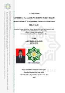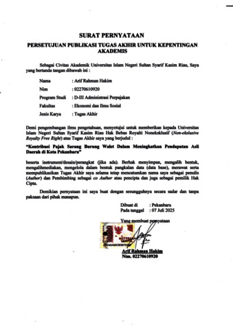 ABSTRAK KONTRIBUSI PAJAK SARANG BURUNG WALET DALAM MENINGKATKAN PENDAPATAN ASLI DAERAH DI KOTA PEKANBARU OLEH ARIF RAHMAN HAKIM 02270610920 Pajak Sarang Burung Walet merupakan salah satu jenis pajak daerah yang diterapkan di Kota Pekanbaru. Tujuan dari penelitian ini adalah untuk mengetahui seberapa besar kontribusi pajak sarang burung walet terhadap Pendapatan Asli Daerah (PAD) Kota Pekanbaru. Penelitian ini menggunakan data tahunan dari tahun 2022 hingga 2024. Hasil penelitian menunjukkan bahwa kontribusi pajak sarang burung walet terhadap PAD Kota Pekanbaru cenderung mengalami fluktuasi dan belum memberikan dampak signifikan secara keseluruhan. Meskipun pada beberapa tahun target penerimaan terlampaui, secara umum tingkat efektivitas kontribusinya masih tergolong rendah. Oleh karena itu, upaya peningkatan pendapatan dari sektor ini perlu ditingkatkan, antara lain melalui penguatan sistem pengawasan, optimalisasi penerapan sistem self-assessment, serta peningkatan kesadaran dan kepatuhan wajib pajak. Kata Kunci: Kontrubusi, Pajak Sarang Burung Walet,Pendapatan Asli Daerah