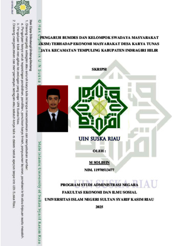 M. SOLIHIN, - (2025) PENGARUH BUMDES DAN KELOMPOK SWADAYA MASYARAKAT (KSM) TERHADAP EKONOMI MASYARAKAT DESA KARYA TUNAS JAYA KECAMATAN TEMPULING KABUPATEN INDRAGIRI HILIR. Skripsi thesis, UNIVERSITAS ISLAM NEGERI SULTAN SYARIF KASIM.