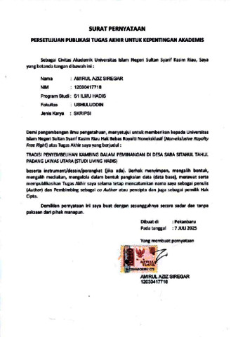 AMIRUL AZIZ SIREGAR, - (2025) TRADISI PENYEMBELIHAN KAMBING DALAM PEMINANGAN DI DESA SABA SITAHUL TAHUL PADANG LAWAS UTARA (STUDI LIVING HADIS). Skripsi thesis, UNIVERSITAS ISLAM NEGERI SULTAN SYARIF KASIM RIAU.