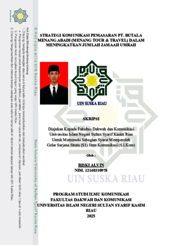 RISKI ALVIN, - (2025) STRATEGI KOMUNIKASI PEMASARAN PT. BUTALA MENANG ABADI (MENANG TOUR & TRAVEL) DALAM MENINGKATKAN JUMLAH JAMAAH UMRAH. Skripsi thesis, UNIVERSITAS ISLAM NEGERI SULTAN SYARIF KASIM RIAU.