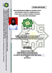 Pengaruh Program Spiritual Building Untuk Menumbuhkan Semangat Beribadah Pada Warga Binaan Lembaga Pembinaan Khusus Anak (LPKA) Kota Pekanbaru Anak adalah anugerah dari Yang Maha Kuasa untuk dididik dan dibina sedemikian rupa sebagai bentuk rasa syukur supaya anak tumbuh menjadi pribadi yang baik. Dalam satu kondisi anak dapat bersentuhan dengan hukum baik karena kenakalan remaja dan perbuatan lainnya, sehingga membuat anak harus memperoleh pembinaan secara khusus. Tujuan penelitian ini adalah untuk melihat pengaruh yang ditimbulkan dari program spiritual building terhadap semangat beribadah anak binaan pada LPKA Kota Pekanbaru. Penulis menggunakan jenis penelitian Deskriptif Kuantitatif. Penelitian kuantitatif dapat didefinisikan sebagai suatu jenis penelitian yang bersifat sistematis dan terstruktur dengan tahapan yang jelas, bertujuan untuk menjelaskan atau menggambarkan suatu fenomena sosial yang ada. Penelitian dilakukan pada LPKA Kelas II A Kota Pekanbaru. Populasi sebanyak 65 orang dan penulis menggunakan teknik total sampling sehingga semua populasi dijadikan sebagai sampel. Pengumpulan data menggunakan teknik observasi, angket, dan dokumentasi. Data yang diperoleh diolah menggunakan aplikasi spss versi 25.0. Hasil penelitian menunjukkan bahwa t hitung lebih besar dari pada t tabel dengan nilai 2,506 ≥ 1,695, hasil ini menunjukkan bahwa Hipotesis o ditolak dan Hipotesis a diterima. Sehingga terdapat pengaruh Program Spiritual Building Untuk Menumbuhkan Semangat Beribadah Warga Binaan Lembaga Pembinaan Khusus Anak (LPKA) Kota Pekanbaru. Kemudian Program Spiritual Building memberikan dampak yang sangat besar bagi warga binaan Lembaga Pembinaan Khusus Anak (LPKA) Kota Pekanbaru. Melalui program ini warga binaan memperoleh dorongan untuk lebih berbenah dalam memperbaiki diri menjadi lebih baik. Kata kunci: Spiritual Building, Semangat Beribadah, LPKA.