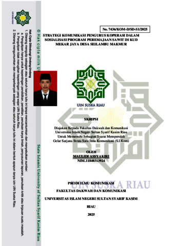 MAULIDI ASSYAKIRI, - (2025) STRATEGI KOMUNIKASI PENGURUS KOPERASI DALAM SOSIALISASI PROGRAM PEREMAJAAN SAWIT DI KUD MEKAR JAYA DESA SEILAMBU MAKMUR. Skripsi thesis, UNIVERSITAS ISLAM NEGERI SULTAN SYARIF KASIM RIAU.