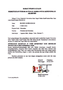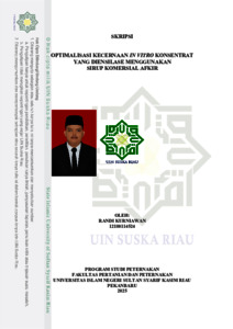 OPTIMALISASI KECERNAAN IN VITRO KONSENTRAT YANG DIENSILASE MENGGUNAKAN SIRUP KOMERSIAL AFKIR Randi Kurniawan (12180114524) Di bawah bimbingan Sadarman dan Muhamad Rodiallah INTISARI Sirup komersial mengandung gula sederhana (glukosa dan fruktosa), mudah dicerna dan mampu meningkatkan energi serta cita rasa pakan. Pada ruminansia, glukosa berperan penting dalam menunjang aktivitas mikroba rumen dan proses metabolisme, terutama saat kebutuhan energi meningkat, namun, jika diberikan berlebihan, glukosa dapat memicu gangguan pencernaan, sehingga penggunaannya perlu dikontrol. Penelitian ini bertujuan untuk mengevaluasi pengaruh penambahan sirup komersial afkir (SKA) sebagai aditif silase berbasis konsentrat terhadap kecernaan bahan kering, bahan organik, protein kasar, serta kadar PK secara in vitro. Penelitian dilakukan secara eksperimental dengan Rancangan Acak Lengkap yang terdiri atas lima perlakuan dan lima ulangan. Perlakuan meliputi: P1 (kontrol tanpa SKA), P2 (1,50% SKA dari BK), P3 (3% SKA), P4 (4,50% SKA), dan P5 (6% SKA). Parameter yang diukur meliputi kecernaan BK, BO, dan PK, serta kandungan PK dalam silase berbasis konsentrat tinggi protein. Data dianalisis menggunakan analisis ragam dengan perangkat lunak SPSS versi 26.0, dan dilanjutkan dengan uji Duncan pada taraf signifikan 5%. Hasil penelitian menunjukkan bahwa penambahan SKA memberikan pengaruh sangat nyata (P<0,01) terhadap kecernaan BK, BO, dan PK, sebaliknya, kandungan PK silase menurun pada level SKA yang lebih tinggi. Kesimpulannya, penambahan SKA sebesar 4,50% dari BK menghasilkan nilai kecernaan terbaik (KcBK 63,1%; 66,3%; KcPK 75,3%), yang mengindikasikan bahwa SKA mampu memperbaiki proses fermentasi dan meningkatkan kualitas nutrisi silase secara keseluruhan. Kata Kunci: In vitro, kecernaan, konsentrat, SKA, silase