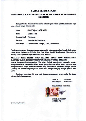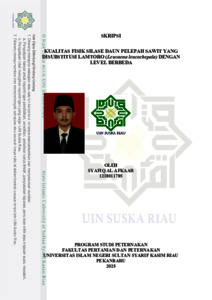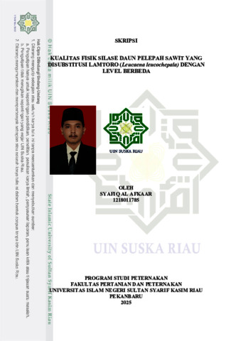 KUALITAS FISIK SILASE DAUN PELEPAH SAWIT SILASE YANG DISUBSTITUSI LAMTORO (Leucaena leucochepala) DENGAN LEVEL BERBEDA Syafiq Al Afkaar (12180111785) Di bawah bimbingan Anwar Efendi Harahap dan Dewi Ananda Mucra INTISARI Pelepah kelapa sawit memiliki potensi nutrisi untuk dijadikan pakan, dengan kandungan serat yang tinggi pada pelepah sawit, diperlukan fermentasi hijauan pakan ternak (silase). Silase pelepah sawit dapat ditambahkan lamtoro untuk meningkatkan kandungan protein dalam silase. Penelitian ini bertujuan untuk mengetahui kualitas fisik silase yang meliputi aroma, keberadaan jamur, warna, tekstur, dan pH silase. Penelitian ini akan dilakukan pada Desember 2024 hingga Januari 2025 di Laboratorium Nutrisi dan Teknologi Pakan Fakultas Pertanian dan Peternakan Universitas Islam Negeri Sultan Syarif Kasim, Riau. Penelitian ini dilakukan secara eksperimental menggunakan RAL Rancangan Acak Lengkap dengan 4 perlakuan dan 5 ulangan. P1 : Daun Pelepah Sawit 100%, P2 : Daun Pelepah Sawit 95% + Lamtoro 5%, P3 : Daun Pelepah Sawit 90% + Lamtoro 10%, P4 : Daun Pelepah Sawit 85% + Lamtoro 15%. Parameter yang diamati termasuk aroma, keberadaan jamur, warna, tekstur, dan pH. Data yang diperoleh dianalisis dengan berbagai cara dengan tes tindak lanjut DMRT 5%. Hasil penelitian menunjukkan bahwa penambahan lamtoro terhadap silase daun pelepah sawit memiliki efek yang sangat nyata (P<0,01) pada aroma, keberadaan jamur, warna, dan tekstur dan tidak memiliki efek yang sangat nyata (P>0,05) pada pH. Silase daun pelepah sawit yang ditambahkan ke lamtoro pada tingkat yang berbeda dapat meningkatkan kualitas fisik silase pelepah sawit, yaitu pada warna 3,543 – 3,450 (hijau kekuningan), aroma 3,652 – 3,537 (asam), Keberadaan jamur 2,866 – 2,802 (cukup), tekstur 3,780 – 3,723 (padat) dan pH 3,97 – 4,09 (kualitas baik). Kesimpulan penelitian ini adalah perlakuan 95% daun pelepah sawit + 5% lamtoro + 5% tepung jagung + 5% molases memberikan hasil terbaik dilihat dari aroma, warna, dan tekstur dibanding perlakuan lainnya. Kata kunci: pelepah sawit, silase, lamtoro, kualitas fisik.