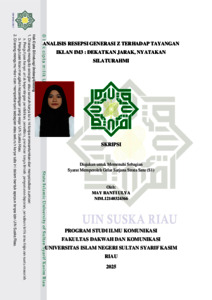 MAY RANTI ULYA (2025) ANALISIS RESEPSI GENERASI Z TERHADAP TAYANGAN IKLAN IM3 : DEKATKAN JARAK, NYATAKAN SILATURAHMI. Skripsi thesis, UNIVERSITAS ISLAM NEGERI SULTAN SYARIF KASIM RIAU.